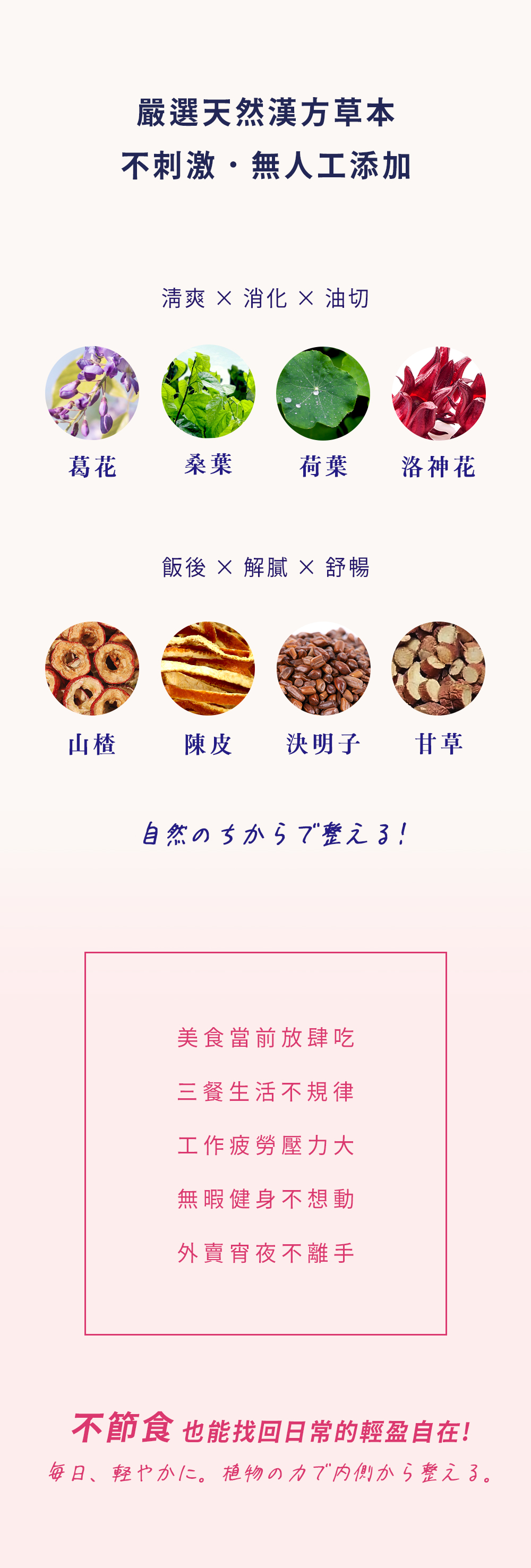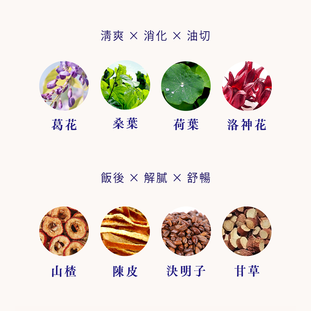 葛花、山楂、決明子、荷葉、甘草、陳皮、洛神花、桑葉、水。